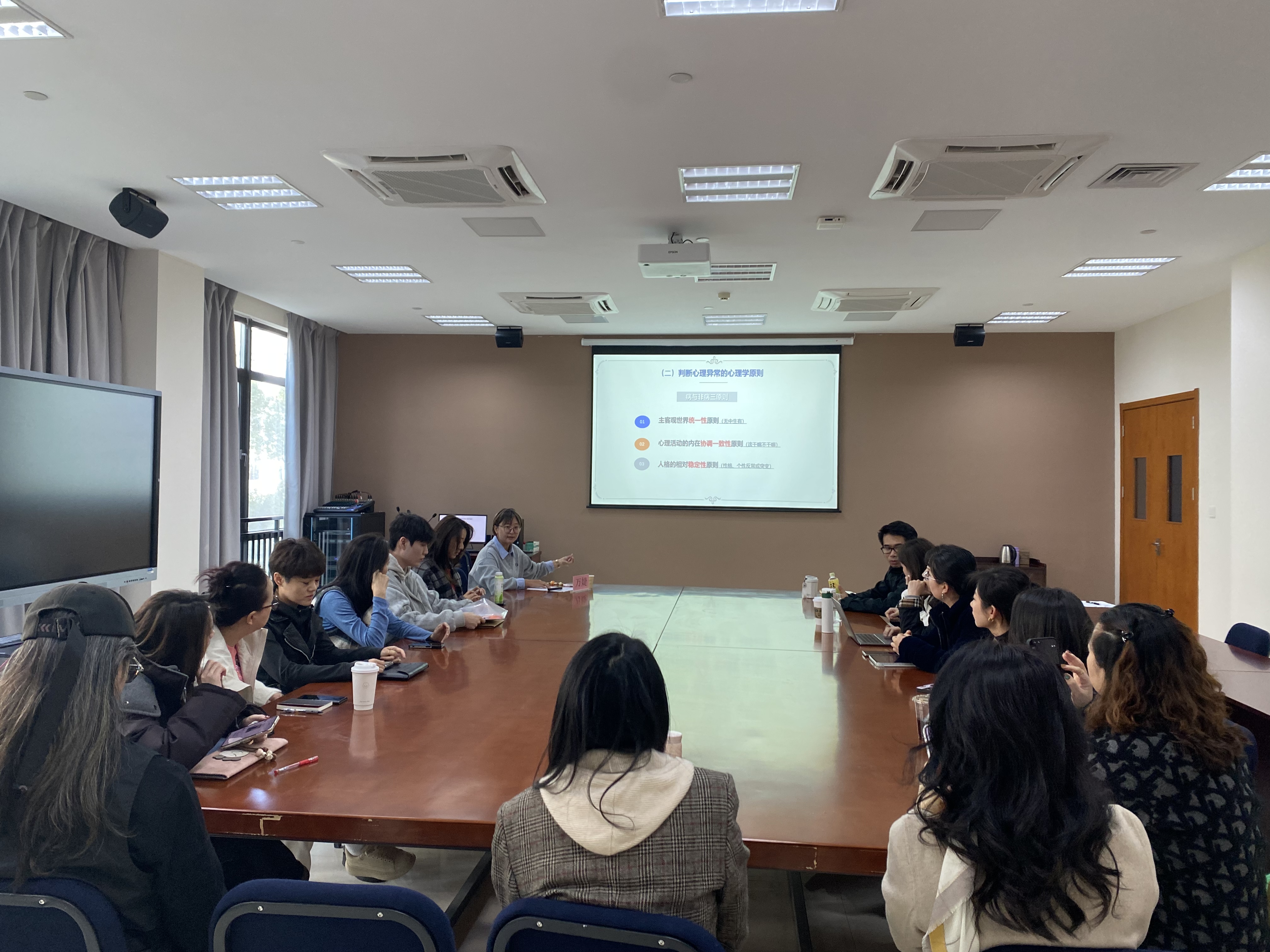 培训会上,万老师围绕“常见心理障碍的识别与应对”“心理危机的识别与处置”两个主题展开讲解。她结合工作实际案例,系统介绍了大学生群体中抑郁症、焦虑症、双相情感障碍等常见心理障碍的早期表现和识别方法,并对班主任在日常工作中如何进行应对,如何与学生进行沟通和谈话做了介绍。